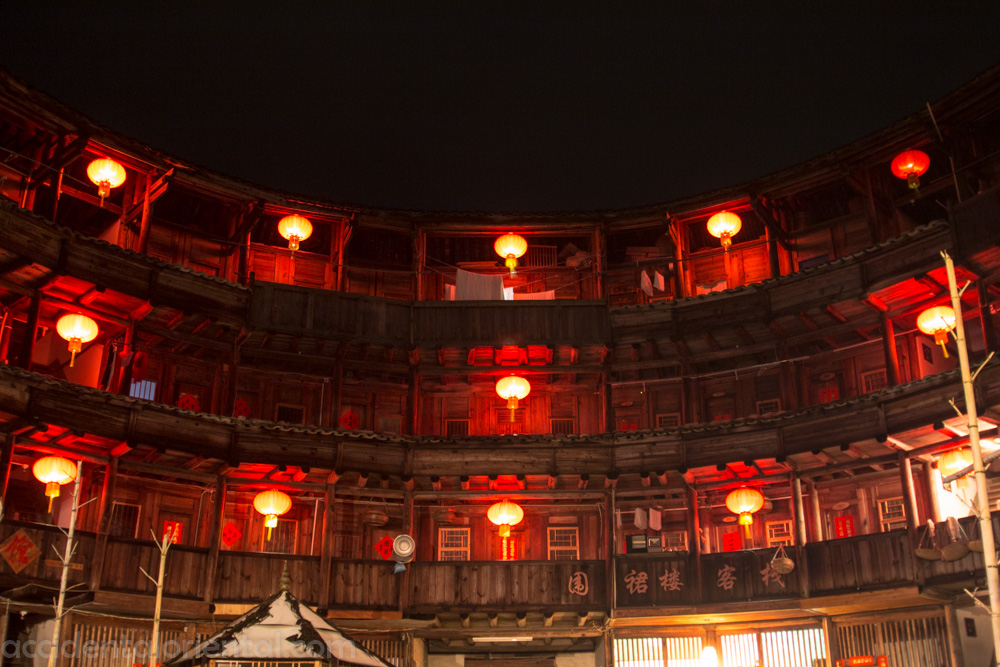 The inside of the 320-year-old Huanjilou building, near the town of Yongding. The Outer ring of the building is for living, cooking and storage, while the inner sections usually house areas for worship and bathing.