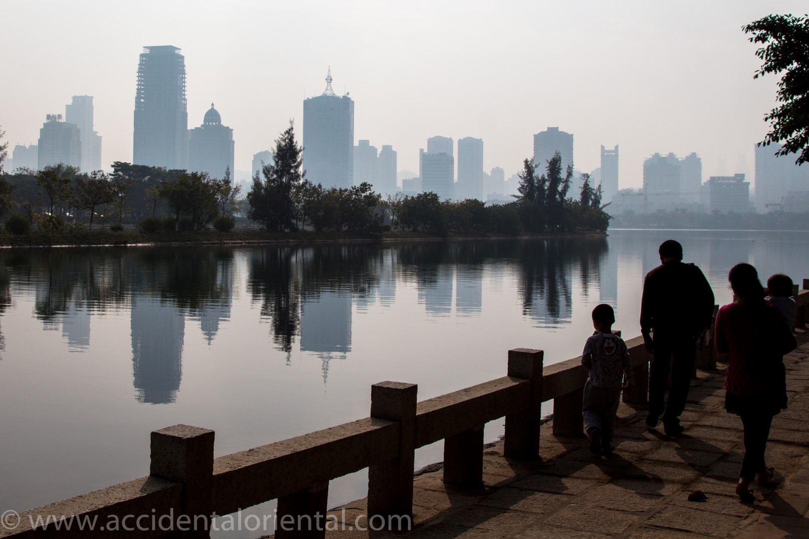 A young family walks the western edge of Yundang Lake near Haiwan Park